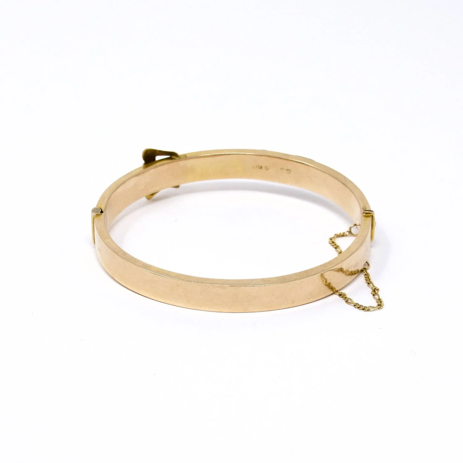 This bangle is a prime example of Aesthetic period jewelry in prime condition. During this time period, designers would mix many different patterns, cultures and inspirations into one design in a sort of collage. This bangle is engraved with a mixture of scroll work and ivy leaves. The wavy yet boxy buckle detail is incredibly rendered. There are a few small dents on the rim but they’re hardly noticeable.
